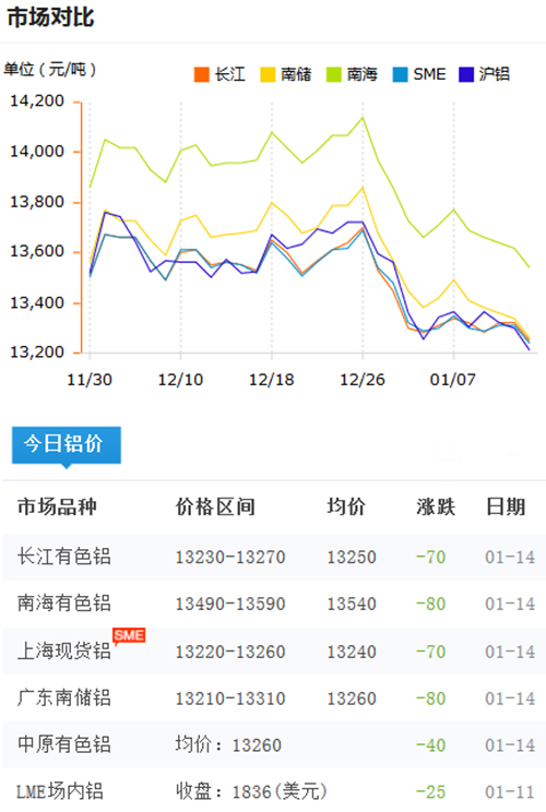 鋁錠價格今日鋁價2019-01-14