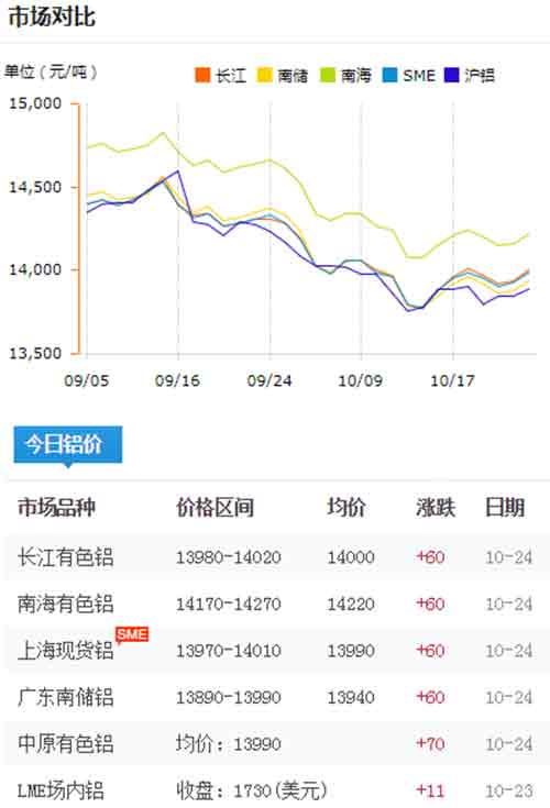 鋁錠價格今日鋁價2019-10-24